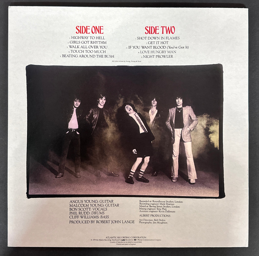 Here's a 2010 British reissue of AC/DC's sixth studio album Highway to Hell (Atlantic - K50628), regarded as one of the band's best records. It was also the last to feature original lead vocalist Bon Scott before his death in 1980. This release is pressed on burning flesh colored vinyl, and both the cover and vinyl are graded as VG++.