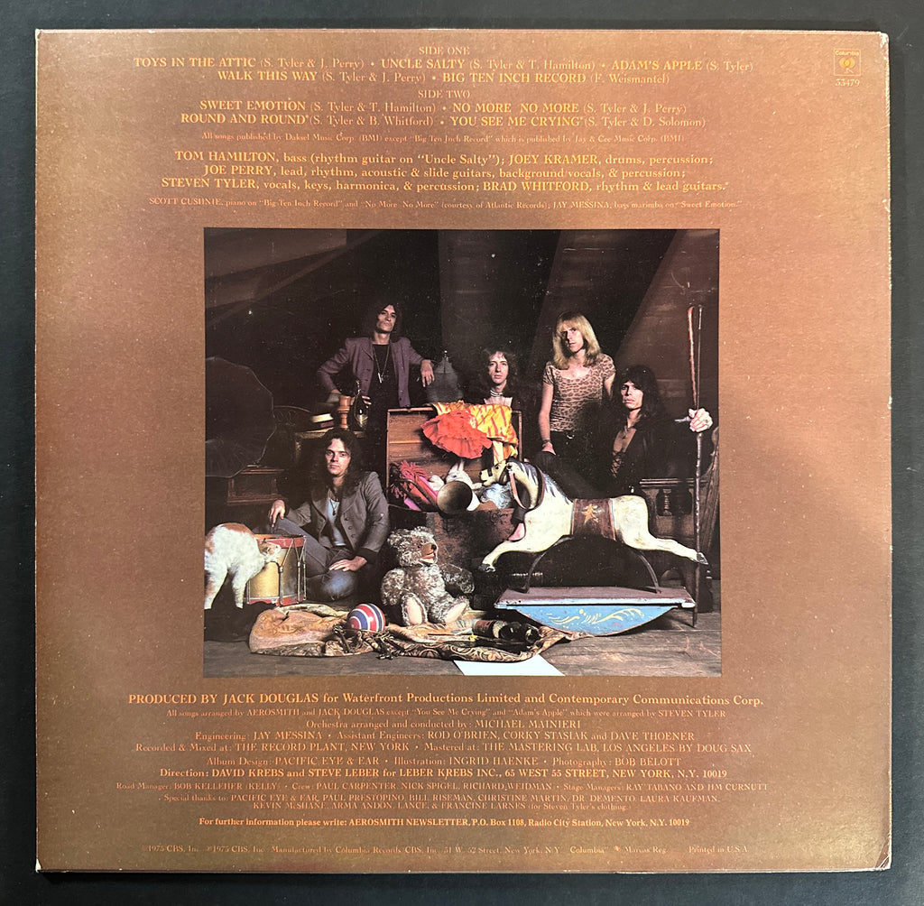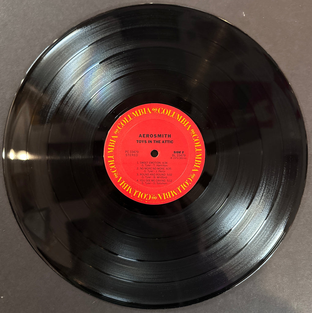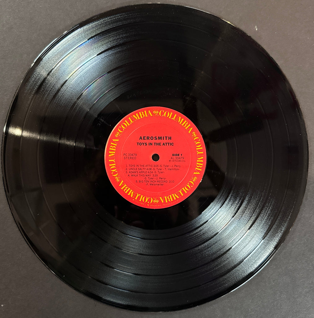 This is a 1st pressing of Aerosmith's 1975 studio album Toys in the Attic (Columbia - PC 33479). This is the band's second-most commercially successful album, containing mega-hits like Sweet Emotion and Walk This Way. Despite the fact that toting this record around to parties was standard practice, both the cover and the vinyl of this record are VG+.